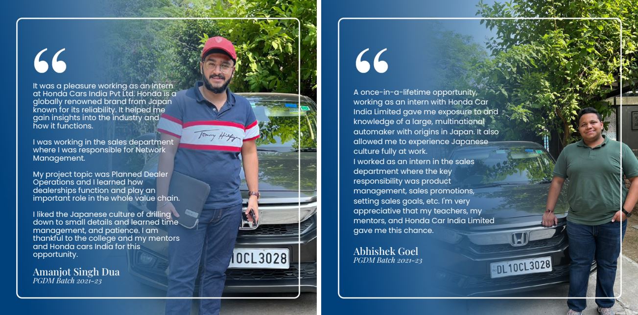 Summer internship and live projects are an integral part of the PGDM curriculum, which gives students the opportunity to work closely with professionals in their chosen field, develop knowledge, competencies, and experience related to their career goals, and enables them in building networks with professionals. Prominent firms offering internship/live project opportunities for students include Percept, Bajaj FinServ, Britannia, Patanjali, Marks & Spencer’s, Marico, ITC, Auto Expo, RJ Corp, IMRB, SMC, Colgate, and Nielsen.